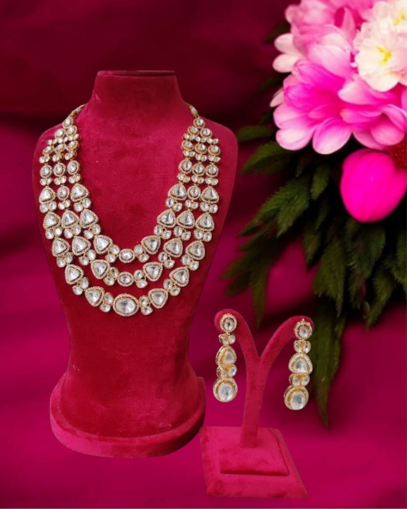 This 3 Layered Kundan Polki Necklace Set adds a touch of elegance and sophistication to any outfit. Crafted with three layers of intricately designed Kundan, this necklace exudes luxury and class. Perfect for formal events or as a statement piece, this necklace is sure to make a lasting impression.