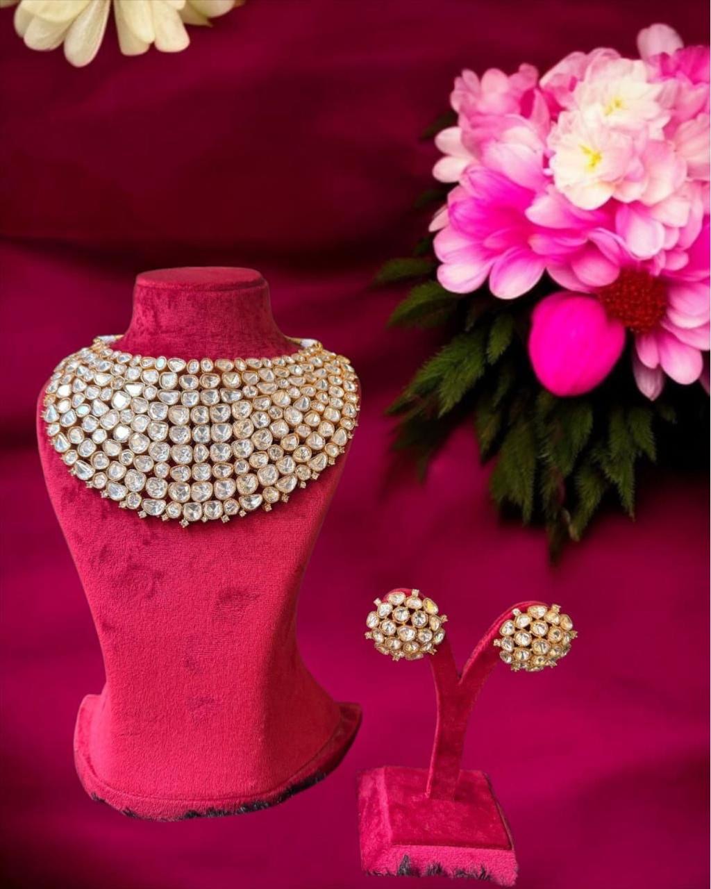 Discover the luxurious beauty of our Golden Polki Necklace. Made from high quality polki, this necklace shines with a golden radiance. Elevate your style and add a touch of glamour to any outfit with our elegant piece of jewelry. Perfect for any occasion, it's a must-have for any fashion-forward individual.