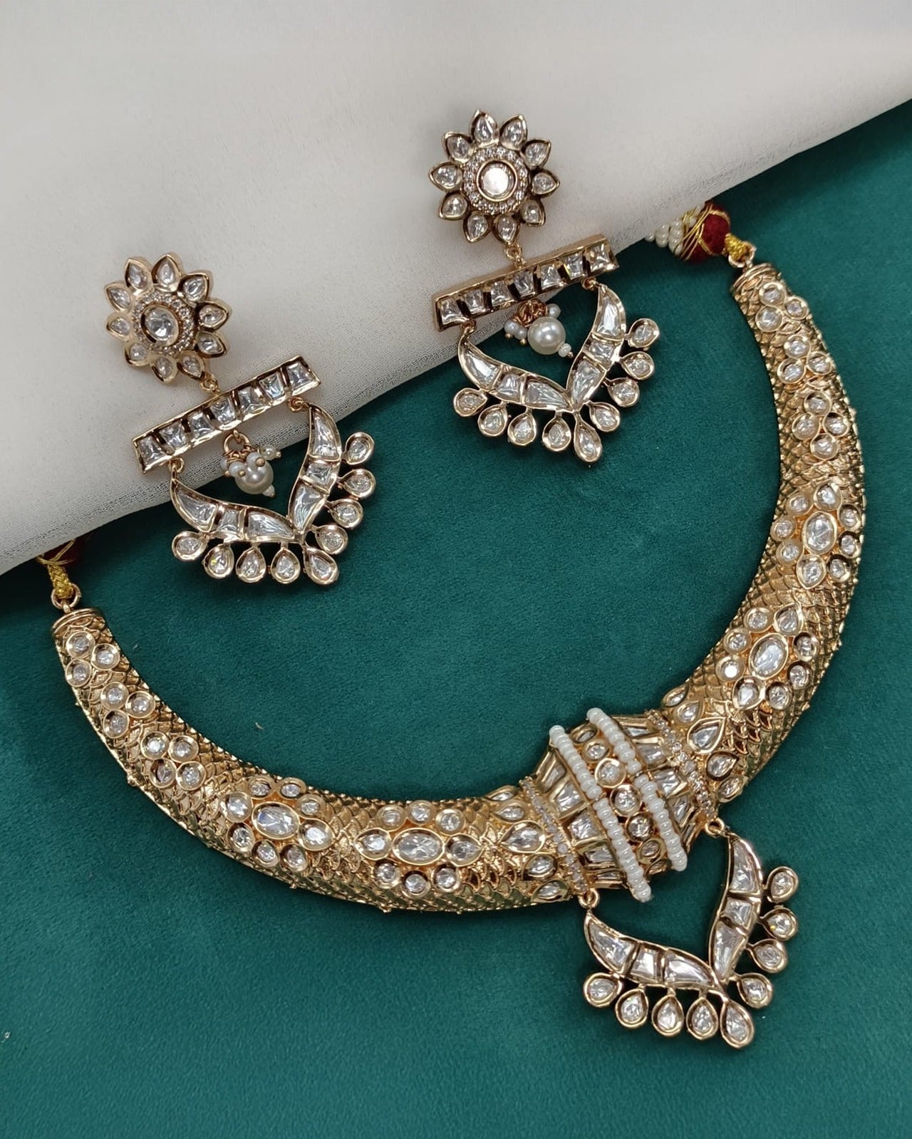 Enhance your outfit with our exquisite Kundan necklace. Made with the highest quality and detailed craftsmanship, this necklace is sure to make a statement. The intricate design and shimmering stones are perfect for any occasion. Elevate your style with this luxurious piece.