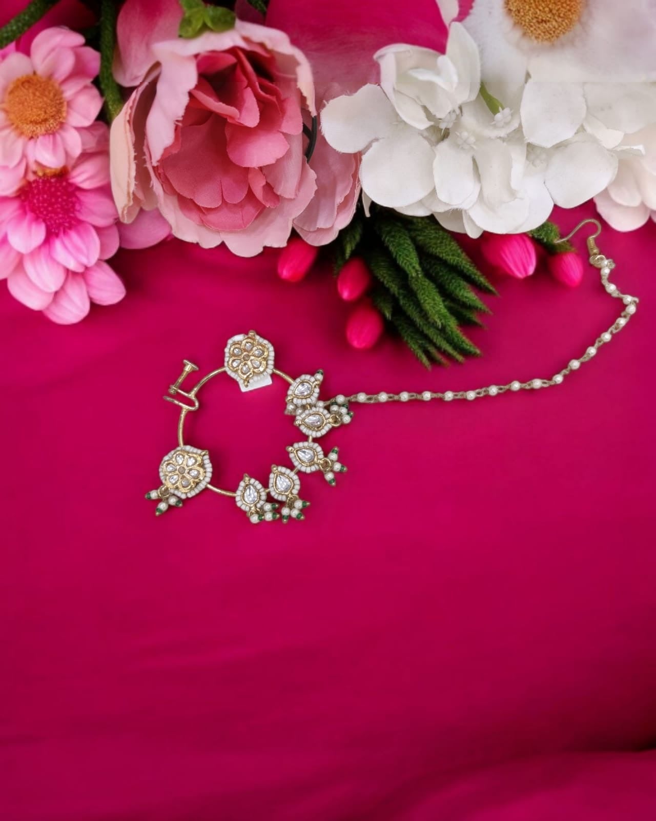 Introducing the Luxe Polki Nath, with exquisite Kundan detailing. Crafted with precision and superior quality, this nath adds a touch of elegance and charm to any traditional outfit. Experience the timeless allure of Kundan and elevate your style to the next level.