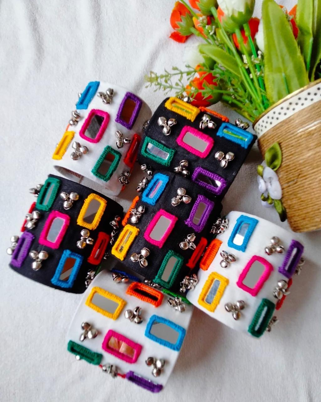 Expertly crafted for the traditional festivities of Navratri, this hand bangle effortlessly combines style and culture. Made with intricate designs and superior quality materials, it is the perfect accessory for any Navratri celebration. Elevate your look and embrace the spirit of the festival with our Mirror Navratri Hand Bungle.