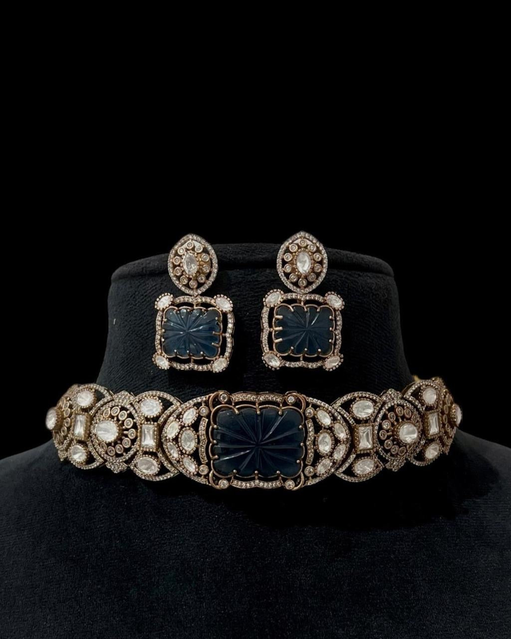 The Polki Choker Necklace Set features traditional Polki stones, which are uncut diamonds that provide a unique aesthetic. This necklace is designed to enhance formal attire, offering a sophisticated touch to any ensemble, and is ideal for cultural or special occasions.